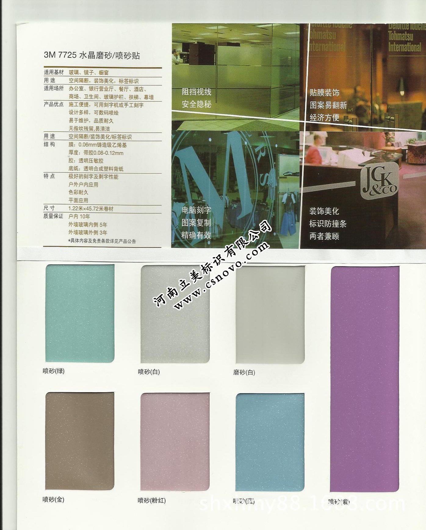 3M 7725系列彩色喷砂装饰膜,具有较强的展示效果,有透光精细麽沙漠、透光棕色金点喷砂膜、透光粉红金点喷砂膜、透光粉蓝金点喷砂膜、透光粉绿金点喷砂膜等六款。贴上后在灯光辉映下更显品质超群